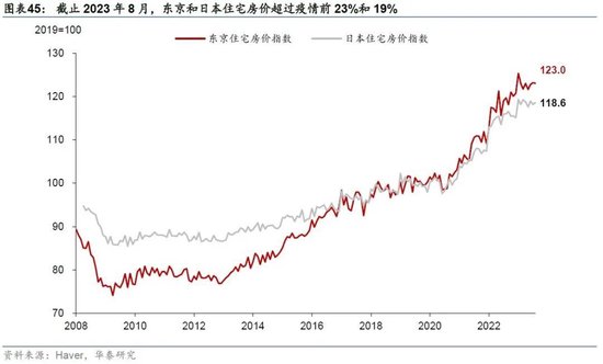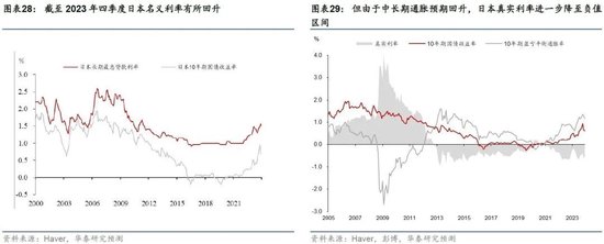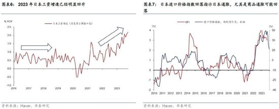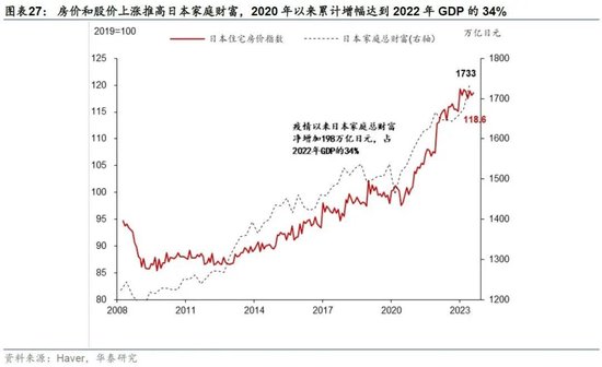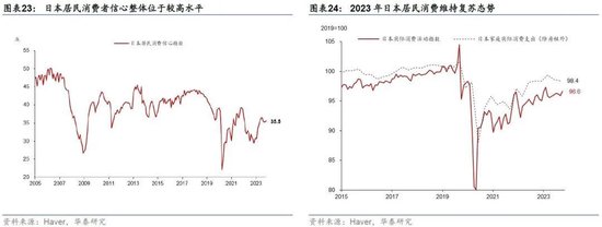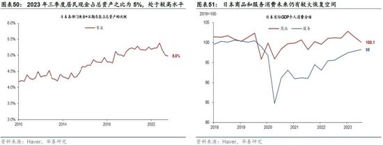 第四,受益于股价和房价持续上涨,疫情以来日本居民净财富增加198万亿日元,约占2022年GDP的34%(图表27),财富效应也有望继续对2024年消费产生支撑。