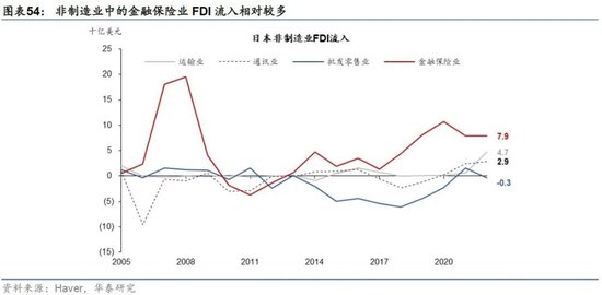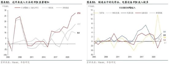 ☞ 受益于企业资本开支周期、尤其是半导体产业链本土投资和FDI、以及自动化相关行业有望继续享受较高的需求和收入增长。正如我们在第二部分的论述,日本企业的资本开支周期有望在盈利周期、政府产业政策、劳动力价格三重因素同时推动下继续走高,特别是受到政府产业政策支持的半导体产业链,日央行植田和男引用的调查显示相关企业有意扩大在日本本国的产能。此外,近年来流入日本的FDI显著增加,相关行业受益或较大。其中,制造业中的化学品、电器设备以及非制造业中的金融保险FDI流入较多(图表52-图表54)。最后,日本工资增速上涨以及人工短缺会推动企业加大对自动化的投入,相关行业有望享受较高需求和收入增速。