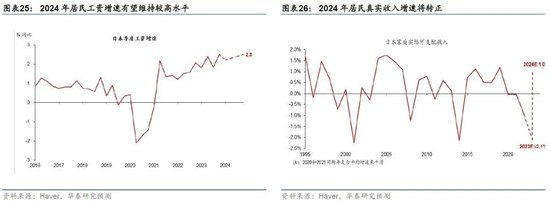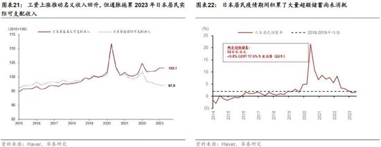 2. 更进一步:本土消费增长有望加速。受益于工资上涨,2023年日本居民名义收入增速明显回升,但由于通胀绝对水平较高,实际可支配收入增长为负(图表21),拖累消费需求,然而,由于疫情期间居民积累大量超额储蓄,且居民消费信心低位回升,2023年居民消费仍然低位修复(图表22-24)。往前看,2024年居民收入增速有望维持在较高水平,且收入增长可能超过平均通胀水平、真实收入增长有望转正(图表25-26)。具体来看: