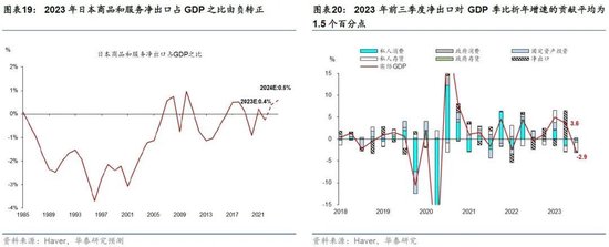 1. 随着日元明显升值,增长动能将从出口向内需转换。2023年由于实际进口规模,叠加海外游客复苏提振服务业出口,2023年商品和服务净出口占GDP之比由负转正(图表19),提振2023年GDP增速,2023年前三季度净出口对GDP季比折年增速的贡献平均为1.5个百分点(图表20)。往前看,2024年全球增长偏弱,叠加日元明显升值,日本出口可能承压,经济增长动能将向内需(消费+投资)切换。根据我们的预测,2024年净出口对GDP的贡献将从2023年的0.7%下降0.5个百分点至0.2%,而消费和投资对GDP的贡献将达到0.8%,成为2024年增长的主要推动力量。