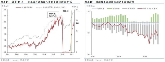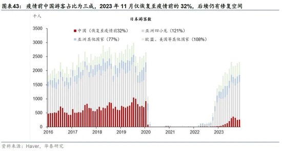 5. 虽然较2023“重启年”可能边际放缓,但中国游客入境数量继续回升有望支持入境消费增长。2022年10月日本打开国门后,海外游客数量在2023年快速修复。截至2023年11月海外游客数量已经修复至疫情前91%。游客人数显著复苏提振日本服务出口(图表41),推动经常项目中服务项逆差持续收窄(图表42)。往前看,2024年服务出口或较2023“重启年”可能边际放缓,但中国仍有修复空间,有望支撑入境消费增长。一方面,疫情前中国游客约占日本海外游客的三成,2023年11月中国游客数仅恢复至疫情前水平的32%,2023年8月中国恢复了赴日团体游,中国游客仍有进一步修复空间(图表43)。另一方面,中国游客在日本的消费力较强。根据日本朝日新闻在2023年10月18日报道,2023年7-9月日本入境游客中,游客人数占比为15%的中国游客在总消费中的占比达到20.3%,若后续中国游客人数持续恢复,则日本旅游消费有望进一步回升。