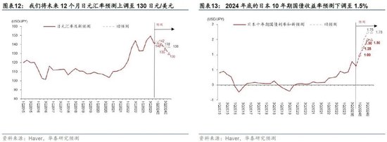 3. 结合1和2,日元有望明显升值,日债利率曲线抬升。美欧通胀明显回落的背景下,日本再通胀继续延续,预计日本与美欧通胀差异将进一步收窄,从而推动日元升值,以及日债收益率曲线抬升。尤其考虑到美国降息可能快于此前预期(参见《全球通胀下行速度超预期的宏观含义》,2023/12/17)。我们上调12个月日元汇率预测至130日元兑1美元(此前预测为138)(图表12)。但同时,鉴于美国国债利率明显下行,我们下调2024年底日本10年国债利率预测至1.5%(图表13)。