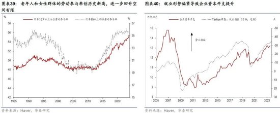 ☞ 劳工市场偏紧同样有望推动企业提高资本开支。2023年以来日本劳动力市场总体偏紧,截至11月,日本失业率录得2.5%,为历史较低水平(图表37),新增岗位空缺和新增求职人数之比仍处高位(图表38)。安倍经济学推出后,日本劳动参与率偏低的老年人和女性群体的劳动参与率持续回升,当前已经接近历史新高(图表39),进一步回升空间有限。劳动市场供需失衡增加了工会的议价权,推高了工资增速。为了应对人工短缺和工资增速的上涨,日本企业或继续增加资本开支(图表40)。
