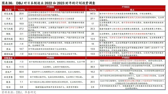 ☞ 日本的企业治理改革以及相关产业政策也将加速企业投资。安倍经济学以来日本政府围绕“维持企业中长期可持续的增长,提高企业价值”这一目标持续推进企业治理政策改革,2014年和2015年分别制定了《尽职管理准则》以及《日本公司治理准则》,2023年进一步推进东京证交所(TSE)改革。其中东京证交所(TSE)改革以提高企业ROE为治理核心,一方面可以推动企业减少现金并增加股票回购,另一方面促进企业加强投资优质资产以提高企业的经营业绩,解决日本上市企业长期存在的“现金囤积”、“可持续发展水平较低”等问题。近年来日本政府针对关键产业的财政支持也在持续发力,日本2022财年的第二份补充预算规模为历史第三大,共29.1万亿日元(占2022年GDP的5.4%),其中与促进企业在人力和资本投入相关的财政支出达5.5万亿日元,约占GDP的1.0%。即将推出的规模约为13.1万亿日元(占GDP的2.3%)2023财年补充预算中 ,针对半导体、太空产业的战略投资以及税收减免的规模可能在2万亿,占2022年GDP的0.4%(参见《日元和日债利率:不鸣则已、一鸣惊人》,2023/11/07)。日本发展银行(DBJ)针对2023财年企业投资计划的调查显示,受日本政策扶持力度较大、景气度较高的行业比如半导体、新能源等,产业链上下游的企业计划投资增速大幅增加,比如有色金属(受益于半导体和电池材料)、汽车(电池、电气化相关投资)、钢铁(电动汽车磁性钢板等)等行业计划投资较2022财年分别增长121pct、26pct和31pct(图表36)。而日本政府对于基建以及国家安全方面的投入也加速了交运、电力等非制造业行业的投资。