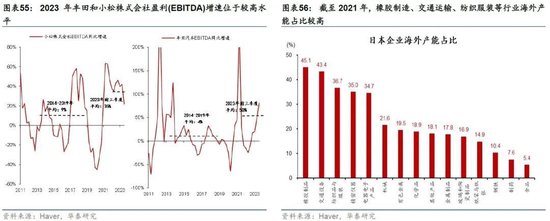 出口导向型劳动密集型行业,如汽车、工程机械边际受损,位于第三象限:上述行业劳动成长占比高,且盈利受到日元升值影响。日本汽车行业依赖于海外市场,其营收中海外占比较高,2023年日元贬值显著提振了相关行业的盈利增速。以丰田为例,2022财年(2022年4月到2023年3月)丰田海外汽车销售收入占比达到77%,2023年前三季度企业盈利(EBITDA)同比增速分别为20%、50%和82%,明显高于2014-2019年4%的平均增速。此外,作为全球领先的建筑和采矿设备制造商,2023年前三季度小松株式会社海外营收占比为91%,2023年前三季度盈利同比增速也达到40%、42%和22%,明显高于2014-2019年9%的平均增速(图表55)。随着日元升值以及国内工资增速上升,2024年劳动密集型行业以及海外收入占比高的行业盈利能力可能不及2023年,特别是海外营收和海外产能占比高的行业,例如橡胶制造、交通运输、纺织服装等行业(图表56)。