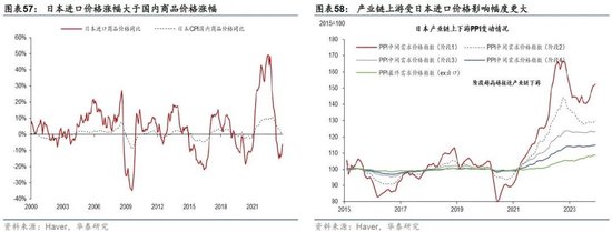 电子电器设备制造、产业链上游的进口加工等行业位于第四象限:这些行业进口原材料占成本比例较高,受益于日元升值,但劳动成本占比高。疫情期间,供应链扰动、能源价格上涨以及日元贬值一度导致以日元计价的进口价格同比上涨近50%,上游行业受到的相对更大(图表57-图表58)。日央行副行长冰见野良三提到,调查显示,中小企业将高进口成本通过产业链向下传导的能力相对有限,高进口价格挤压此类企业利润。2024年随着全球供应链的持续恢复,原油等大宗商品价格位于低位,日元整体升值,日本进口价格指数将有所回落,原油及相关制品、粗钢及相关制品、化工原材料、农产品等位于产业链上游的企业以及电子电器设备、化学品等进口占比高的行业可能受益(图表58)。