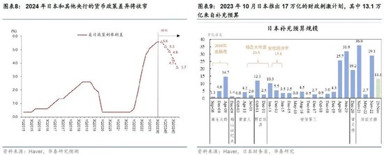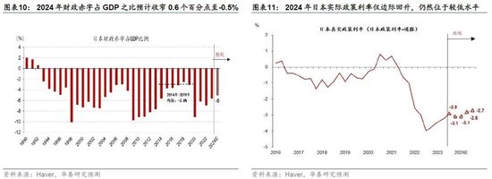 2. 货币和财政政策保持相对宽松的绝对水平,但货币政策将稳步正常化,财政政策边际“撤火”。首先值得重申,日本货币政策将逆全球趋势边际收紧,大幅推升日元估值。2024年美欧央行均将开启降息周期(参见《联储会降息吗、如何降?》,2023/11/5;《欧元区:增长或将面临更大挑战》,2023/11/7),而日央行则有望加速货币政策正常化,退出YCC并启动加息进程。预计日央行和全球其他央行之间的货币政策差异收窄(图表8),将大幅推升日元估值,推动日元升值。此外,我们认为周期性政策适当收紧有利于防止经济明显过热、并延长日本再通胀周期。2024年货币和财政政策保持相对宽松的绝对水平。例如2023年10月,日本推出规模为17万亿日元(3.1% of 2022年GDP)的财政刺激计划,其中13.1万亿来自补充预算,为历史上第七大规模补充预算(图表9),2024年财政赤字预计为5.0%,相对2023年下降0.6个百分点(图表10),财政边际收紧,但绝对水平仍然较为宽松,2024年财政赤字占GDP之比仍然显著高于2014-2019年的平均水平。从真实利率来看,虽然2024年日央行可能加息,推动货币政策边际收紧,但是由于通胀位于高位,实际政策利率仍然为负,位于较低水平(图表11)。财政和货币政策的边际收紧有助于避免经济过热,通胀大幅攀升,客观上有助于延长日本的再通胀周期。
