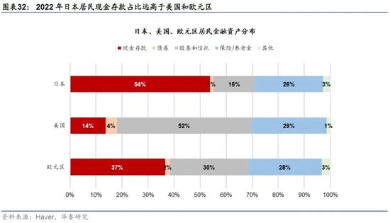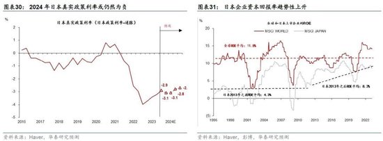 3. 居民和企业投资意愿有望上升。2023年日央行调整YCC框架,推动10年期日债收益率和日本长期最惠贷款利率小幅回升(图表28),但由于通胀大幅上行,日本真实利率仍然维持在-0.5%至-0.6%的低位,低于2014-2019年-0.4%的中枢(图表29)。2024年,随着日央行加速货币政策正常化,名义利率可能进一步上行,但考虑到通胀仍然位于较高水平,真实利率仍然持续大幅为负(图表30),同时考虑到企业资本回报率趋势性上升(图表31),再通胀持续、负利率有望切实推居民和企业的投资意愿。此外,日本家庭金融资产中,2022年现金/存款占比为54%,远高于美国和欧元区的14%和37%(图表32),负利率环境下居民有动机增持现金外的其他资产。