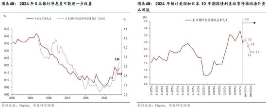 ☞ 本土金融行业也可能受益。第一,日央行货币政策正常化有助于推动银行等金融企业息差放大,从而改善其盈利。2020年以来,随着日本国债收益率曲线的陡峭化,日本银行净息差已经触底回升(图表48),预计随着日央行货币政策正常化,银行净息差仍有进一步回升空间。第二,日本国债收益率回升,日本与海外利差收窄(图表49),推动海外资本回流,利好日本国内金融行业。根据我们的预测,2024年美日10年期国债收益率差值将从2023年四季度的3.0%下降至2.3%。第三,日本退出负利率后,居民和企业此前所持有的大量现金或重新回归银行体系。截至2023年三季度日本居民和企业现金占比占总资产的5%,位于较高水平(图表50)。随着日本退出负利率,现金或一定程度回流到银行体系。