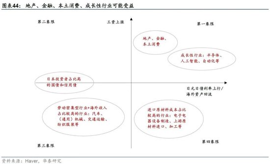根据对劳动力成本以及日元/日债的敏感程度,主要行业/资产的相对表现可以划分为四个象限。2024年日本再通胀持续,劳工成本进一步上行,日元、日债收益率将回升,不同行业受益或者受损的相对情况存在差异。其中,1)地产、金融、本土消费,以及半导体、自动化、人工智能等相关产业链最受益,位于第一象限:地产行业、本土消费受益于居民工资收入和收入增长以及负实际利率下居民资产配置需求,金融受益于利率曲线上移以及资本回流,而半导体、自动化、人工智能等成长性行业人工成本占比相对较低。2)出口导向型劳动密集型行业,如汽车、工程机械边际受损,位于第三象限:上述行业劳动成长占比高,且受到盈利受到日元升值影响。3)电子电器设备制造、产业链上游的进口加工等行业位于第四象限:这些行业进口原材料占成本比例较高,受益于日元升值,但劳动成本占比高。4)日本海外资产回流,或对此前占比相对较高的资产带来阶段性流出压力,如部分国家的国债、信用债等,位于第二和第三象限之间(图表44)。具体来看: