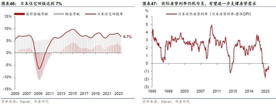 ☞ 地产行业受益于居民收入增长以及负实际利率下居民资产配置需求。疫情后日本房价经历了较快涨幅,截止2023年8月,东京和日本住宅房价超过疫情前23%和19%(图表45)。受益于房价和租金上涨,截至2023年三季度日本住宅回报达到7%(图表46)。如此前所述,2024年居民收入受益于工资增速提高以及日本政府的临时性所得税减免,收入增长有望提振居民住房需求。尽管随着日央行货币政策正常化,日本房贷利率可能会继续回升,但考虑到通胀仍然位于高位,这意味着实际房贷利率仍然为负(图表47)。此外,负实际利率也有望推动居民调整其资产配置,提高房产的配置需求。