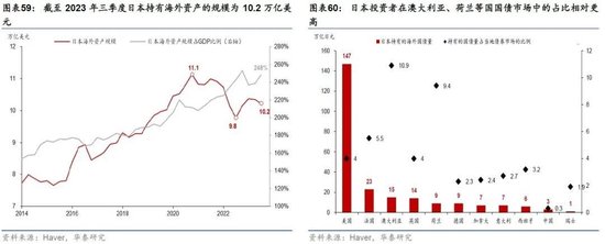 日本海外资产回流,或对此前占比相对较高的资产带来阶段性流出压力,如部分国家的国债、信用债等,位于第二和第三象限之间。2014年以来,日本持有的海外总资产从7.7万亿美元增长至2023年3季度的10.2万亿美元。2024年日本企业的海外资产可能出现回流,特别是证券投资。从海外债券投资的目的地来看,截至2023年二季度,美国规模占到一半,规模约为1.2万亿美元,其次是欧元区,规模为0.4万亿美元,澳大利亚和英国为0.14万亿和0.05万亿美元。尽管日本投资者持有的澳大利亚、荷兰等国债券存量规模小于美债,但是日本投资者的占比显著更高,分别为10.9%、9.4%(图表60)。日本海外资本一定程度回流,或推高上述国家收益率水平。此外,2022年以来,全球大部分央行普遍加息抗通胀,而日央行始终维持负利率,借日元投资海外资产的套息交易规模或再度上升。随着日元升值以及日央行加息,上述套息交易或出现一定程度反转。而由于套息交易普遍投资于新兴市场高息货币,套息交易逆转可能推高新兴市场国家债券收益率,甚至可能拖累新兴市场股票表现。