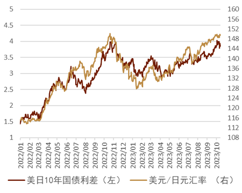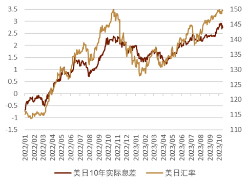 日元表现中等 上周在美元指数小幅走强背景下,日元相较美元基本走平,在G10货币中排名靠前、在亚洲货币中排名中等。上周前三天为弱美元环境,在此背景下日元仍未能实现相较于美元的明显升值,在G10货币中排名靠后;上周四受美国CPI影响,美日汇率由149.20附近快速上行至149.80附近,但此后在上周五,美债利率出现一定下行,在美日息差收紧背景下,日元在上周五出现一定升值。整体来看,上周美日汇率同美元指数、同美债利率的走势存在一定关联 (图表14、图表15)。息差方面,美日汇率同美日名义、实际利率的息差继续出现了一定的背离(图表16、图表17),反映出目前市场或更多交易的是“氛围”与套息交易,日元的贬值在短期内存在一定超调的部分,但这种超调仍有可能持续一段时间。