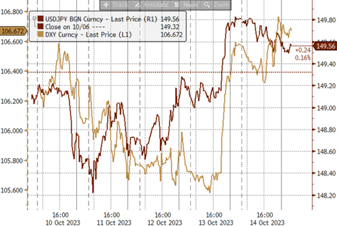 ► 欧元上周并未能延续10月首周的反弹,欧央行9月会议纪要再次强化了市场对加息周期结束的预期,而美国通胀的粘性也带动了美债利率继续维持在高位进而使得德美利差继续走阔,加之上周五中东局势紧张有所恶化带动了市场风险偏好走弱,这也使得包括欧元在内的非美货币明显走弱(图表10)。