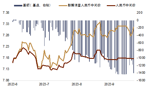 官方解读人民币汇率 央行于10月13日举办了2023年三季度金融统计数据新闻发布会[2],邹澜司长对人民币汇率的近期走势做出了解读,并对未来走势有所展望,且强调了人民币汇率将继续保持稳定。邹司长认为美元走强和国内季节性购汇较多是人民币汇率近几个月走弱的影响因素,中美利差倒挂也部分导致了人民币汇率的贬值,往后看,随着国内政策支持以及经济走强,人民币资产的投资和避险属性显现,跨境资金流动能够自主均衡(图表8)。邹司长重申了央行将“坚决对市场顺周期、单边行为进行纠偏,坚决对扰乱市场秩序行为进行处置,坚决防范汇率超调风险”,我们亦能看到尽管上周人民币汇率小幅走弱,人民币汇率中间价保持了每日小幅调升的节奏(图表9),体现目前央行继续从口头和中间价调整等方面维持稳汇率政策,避免人民币汇率的大幅波动。