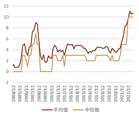 日本通胀或仍在高位停留 上周日本共同通信社报导称[12]“日本央行在10月的议息会议上或将2024年3月底的核心CPI预测由此前的2.5%上调至接近3.0%”。日本央行在2021年4月首次给出了2024年3月的核心CPI预测,首次预测值为1.0%,但此后已进行了5次上修至2.5%(图表18),我们认为在10月日本央行议息会议中,或不仅修改对2024年3月通胀的预测,2025年3月、2026年3月的通胀预测或也将有所被上调,届时或存在较大的调整货币政策的可能性。上周日本央行还公布了9月的《有关生活意识的问卷调查》[13],日本民众对1年后的通胀同比预测的平均数为10.7%、中位数为10%(图表19),相较3个月前并未出现明显变化,而通胀预期有存在自我实现的特征,我们认为明年日本的通胀压力或仍旧较高。