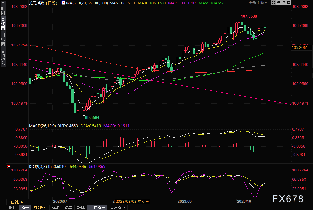 汇市:上周美元上演疯狂逆转。由于对美联储利率见顶的押注不断加强,美债收益率自高位持续回落,叠加美联储官员的意外鸽派转向,美元受拖累自周初持续走低,截止上周三连续6个交易日收跌,为逾三年来最长跌势,最低触及105.53水平,不过在周四超预期的美国CPI通胀数据的提振下,美指疯狂拉升重返106关口上方,扭转当周全部跌幅,上周五更是在中东紧张局势升级的避险买盘影响下触及106.79水平,当周涨幅达到0.54%。