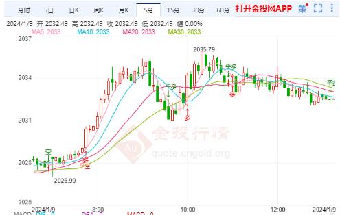 周二(1月9日)本交易日现货黄金日内维持震荡,今日开盘报2028.39美元/盎司,最高触及2035.79美元/盎司,最低触及2026.99美元/盎司,截止发稿金价报2032.50美元/盎司,涨幅0.24%。