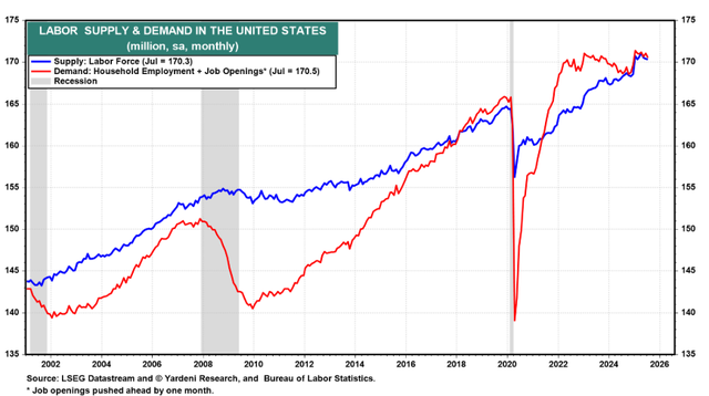 在Yardeni看来,问题主要出在劳动力市场的供给端(见图)。今年以来,由于特朗普政府有效关闭边境及持续的驱逐行动,劳动力规模已停止增长。这种情况下,美联储也应暂缓降息——因为降息会提振对劳动力的需求,加剧劳动力短缺,进而推高薪资和物价通胀率。