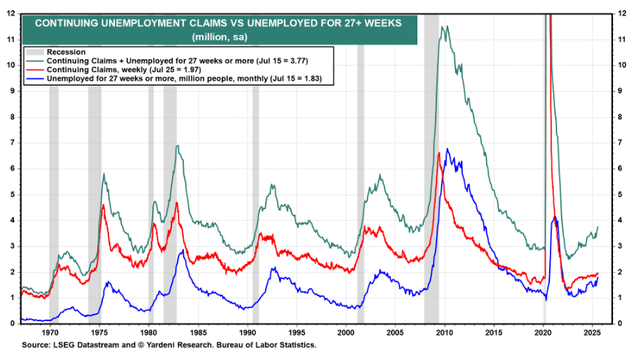 图上半部分为首次申请失业救济人数,下半部分为持续领取失业救济人数值得注意的是,在美国,失业人员原则上可连续申领26周救济金。美国劳工统计局(BLS)每月统计失业持续时间数据。7月数据显示,183万失业者已失业27周及以上。7月25日当周,持续领取失业救济人数升至197万(见图)。