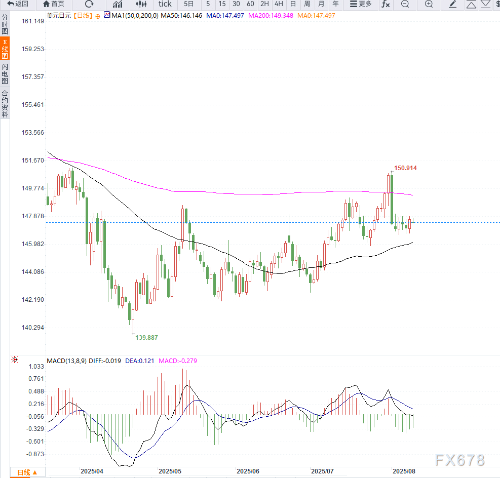 美联储理事Bowman表示,最新的就业疲软迹象凸显了劳动力市场的脆弱性,支持其对今年降息三次的判断。市场目前预计,美联储9月降息的概率接近90%,这在一定程度上压制了美元反弹。周一美国缺乏重要经济数据,投资者将关注美联储官员讲话,以及本周即将公布的美国CPI、PPI数据与日本二季度GDP初值。美元兑日元日内维持在147.00至147.80区间震荡,形成矩形整理格局。若汇价能有效突破147.80压力区(对应7月涨势的38.2%斐波那契回撤位),并站稳148.00上方,或将触发买盘推动价格上探148.50区域,进一步目标为149.00关口。