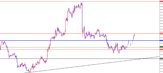 从多周期分析,周线级别来看价格在上上周突破周线阻力,随后在上周再度下破周线支撑,整体上周线价格有进一步上涨的表现,目本周重点关注98.50位置能否站稳是关键。在日线级别上,在上周三跌破日线支撑后,目前价格压制在日线阻力98.50位置,但是目前价格下跌发力,后续一旦站稳将继续上攻。从四小时上看,四小时上是我们一直强调短期价格走势的关键,在上周五价格进行上破并且站上四小时阻力,则前期阻力变支撑,位置上关注98.10-20区间支撑,价格在此位置之上偏多,后续关注日线及周线共振95.50得失。一小时上看价格目前同样有进一步上行的表现,所以暂时先看多头运行,上方关注98.50位置,突破后短线先关注98.80位置。