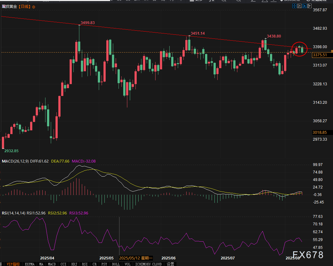 周一(8月11日)亚洲时段,现货黄金跌0.57%,价格守在上周一开盘价附近,现交投于3376.89美元/盎司。上周五(8月8日)关于黄金关税的一些混乱导致黄金期货价格飙升至历史新高,而现货黄金价格变动不大,当天收盘略低于关键的3400美元水平。尽管如此,贵金属上周仍然经历了一周不错的交易,价格上涨了1%,周线录得两连阳。尽管由于全球指数大幅上涨,市场风险偏好急剧增加,但受到美元走弱和数据的推动,黄金表现依然良好。在新的一周,美国消费者物价指数(CPI)可能会为美元和债券收益率定下基调,进而影响黄金的前景。