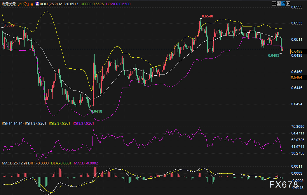 (澳元兑美元小时图,来源:易汇通)北京时间14:58,澳元兑美元现报0.6499/98。
