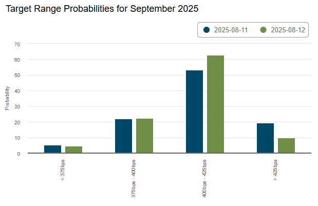 最新非农报告中惨遭大幅下跌的就业数字,以及本周略微低于预期的CPI数据,其实已使许多市场参与者相信美联储主席鲍威尔再也无法继续推迟降息。来自白宫和美国财长贝森特的持续施压,更是令一些业内人士怀疑9月直接降息50个基点,都并非全无可能。