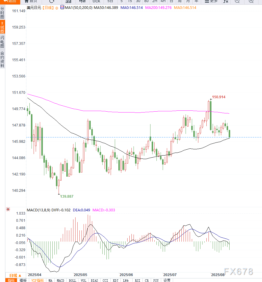 从日线图来看,美元兑日元已经跌破200日均线(约147.00)这一关键支撑位,显示空头占据主动。RSI指标接近超卖区间,短期可能出现技术性反弹,但147.00关口已转为强阻力位。