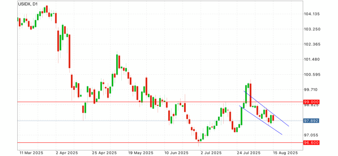 数据显示,一年期通胀预期在7月降至4.4%,较6月5.0%,以及5月6.6%延续下行。五年期预期降至3.6%,已连续三个月回落。同时,周二公布的7月CPI物价通胀指数同比维持2.7%,核心CPI指数同比升至3.1%。在“关税不确定性”与“传导尚未完全”的背景下,若微观通胀预期续降,将与温和CPI共振,压低名义与实际收益率上行空间;一旦一年期或五年期预期反弹,通胀补偿与前端名义利率将迅速上抬,对美元形成短线支撑。昨日PPI高于预期被解读为利润率回升、企业对关税的传导加深,零售端提价的可见度上升,这使得本次UoM通胀预期的边际变化更具指示性。