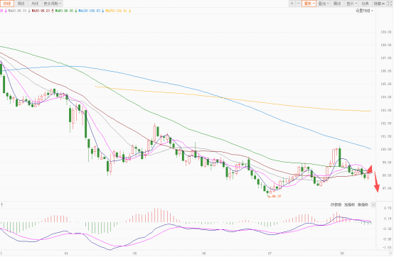 美元指数从100.15的低点一路上涨到110.18的次高点后,再次开启承压回落的走势。目前整体价格跌破并运行在MA250下方,并且跌破100的整数关口,呈明显的空头趋势。日内短线行情则建议看空震荡回落的走势。