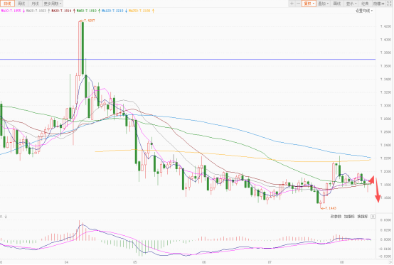 美元对人民币的离岸价经过多次震荡运行,从前期低点6.9651开始再次震荡上涨,目前突破并运行在在MA250均线上方;价格并在4月8日创出7.4287的新高后,出现明显承压回落走势,日内短线行情则建议看空震荡回落的走势。