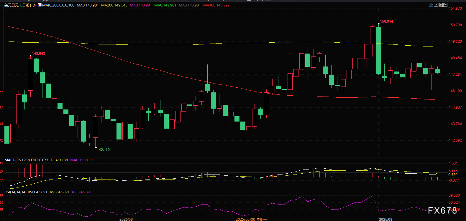 (美元兑日元日线图,来源:易汇通)美元兑日元周四纽约时段逆转了日内早些时候逾100点的跌势,重新回到近期145.80-149.00区间的中轨区域,该区间介于100日与200日均线之间。尽管经济数据和央行政策预期将继续影响该货币对走势,但技术派交易员或可重点关注该区间的突破信号,以捕捉后续高概率行情——若向上突破200日均线,则可能打开上行空间,目标指向151.50中轨的50%斐波那契回撤位;反之若向下破位,则初步目标将指向6月末低点143.00附近。需要警惕的时候,周五亚市,由于美联储9月份大概率仍将降息25个基点,美元依然比较疲软,美元兑日元已经回吐了周四的全部涨幅,仍需提防美元兑日元的进一步下行风险。北京时间10:02,美元兑日元交投于147.29/30。