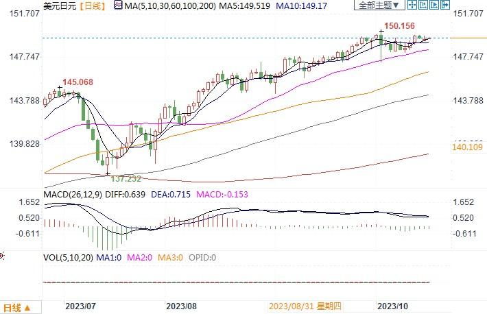 周一(10月16日),美元/日元持平于149.55,接近150的敏感水平。一些交易商认为,如果日元跌破这一水平,日本当局干预以支撑日元的可能性会增加。10月3日,日元兑美元一度达到150.17,为一年来最弱,之后短暂大幅反弹。上周五,日本财务省财务官神田真人周一表示,在日元过度波动的背景下,当局将在必要时采取适当行动,并补充说利率只是决定汇率的一个因素。与此同时,日本出口商等在150.00方向上有卖单,日本进口商等在149.00下有买单,上方和下方还有大量期权到期,或也将在一定程度上帮助抑制过于波动的走势。日线图上,美元/日元继续高位小幅横盘整理之中,且汇价仍运行于布林带通道中轨线之上,且布林带喇叭口逐渐缩窄,显示波动幅度将变得狭窄,近期波动区间料仍主要陷于148-150之间。