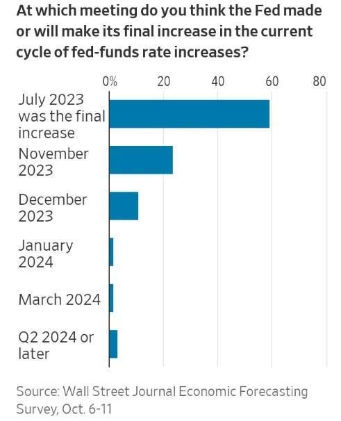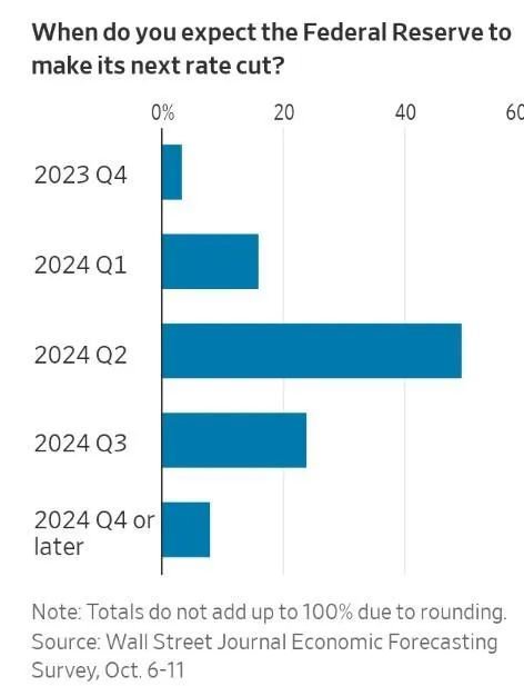 大约一半的经济学家预计,随着经济增长放缓,美联储将在明年第二季度开始降息,失业率(9月份为3.8%)将在2024年6月份升至4.3%。