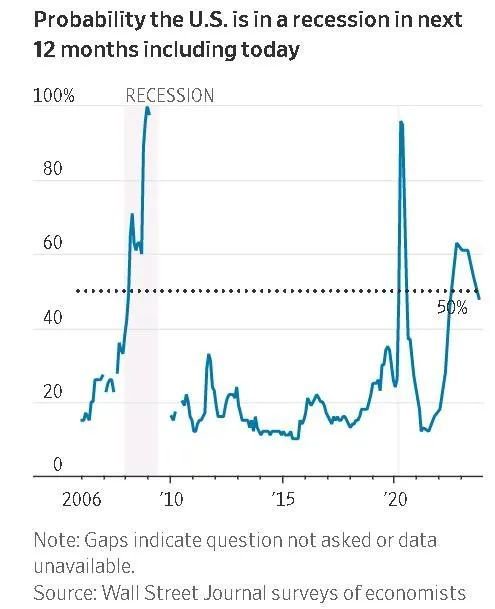 约81%的经济学家还表示,最近债券收益率飙升至2007年以来的最高水平,增加了经济衰退的可能性。但这不足以抵消其他积极因素,使经济衰退必然发生。