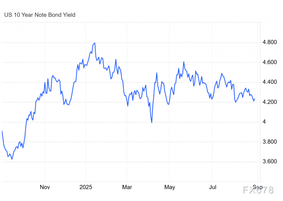 这一转变也与美国10年期国债表现疲软密切相关,该债券收益率目前呈下降趋势,维持在4.2%左右。美联储降息的可能性可能会进一步削弱国债的吸引力,从而为黄金强化其首选避险资产地位提供更大空间。