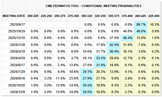 在美联储主席鲍威尔此前于杰克逊霍尔全球央行年会上释放鸽派信号后,金融市场对美联储将在9月16日至17日的政策会议上降息的预期便有所升温。截至发稿,芝商所的“美联储观察工具”显示,美联储在9月降息的概率达到89.7%。
