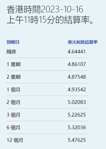 隔夜拆息则跌近6点子,报4.64441%,创近两星期新低。长息方面,6个月及12个月拆息亦微跌,分别报5.32036%及5.47625%。