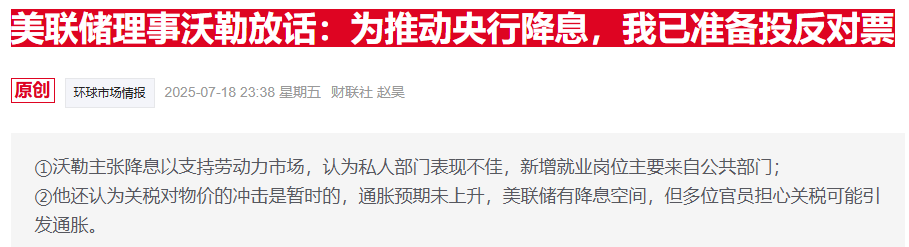 在7月美联储议息会议前,沃勒就曾公开提到,他主张降息以支持劳动力市场。当时他还强调,若同僚们在7月会议上投票维持利率不变,他会投下支持降息的反对票。