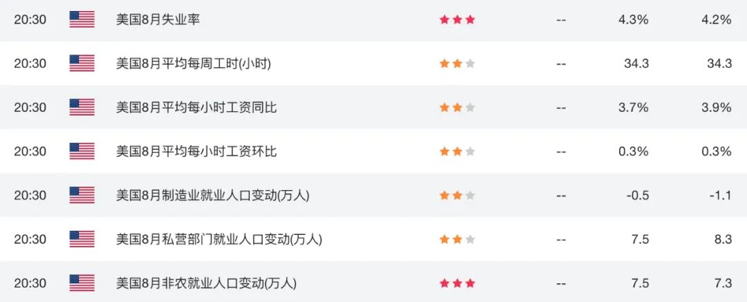 市场预计,8 月非农就业岗位增加 7.5 万个,失业率升至 4.3%。过去三个月,美国月均新增就业岗位仅 3.5 万个,远低于去年同期水平。就业放缓与服务业的温和扩张形成对比,显示出经济动能的不均衡。