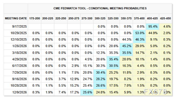 据芝商所集团(CMEGroup)数据显示,9月17日会议降息25个基点的概率周四提升至95.4%,10月29日再次降息25个基点的概率为53%——若两次降息落地,当前4.5%的基准利率或将降至与英国央行4.00%相近的水平。