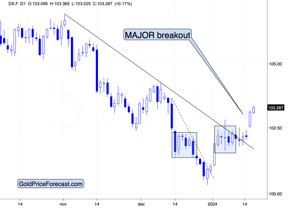 贵金属分析师、Sunshine Profits创始人兼主编Przemyslaw Radomski表示,美元指数果断上行,关键突破已获得验证,他展望买盘将反弹至104上方。他也警告投资者,金价恐将下跌100美元,需要为下行做好准备。
