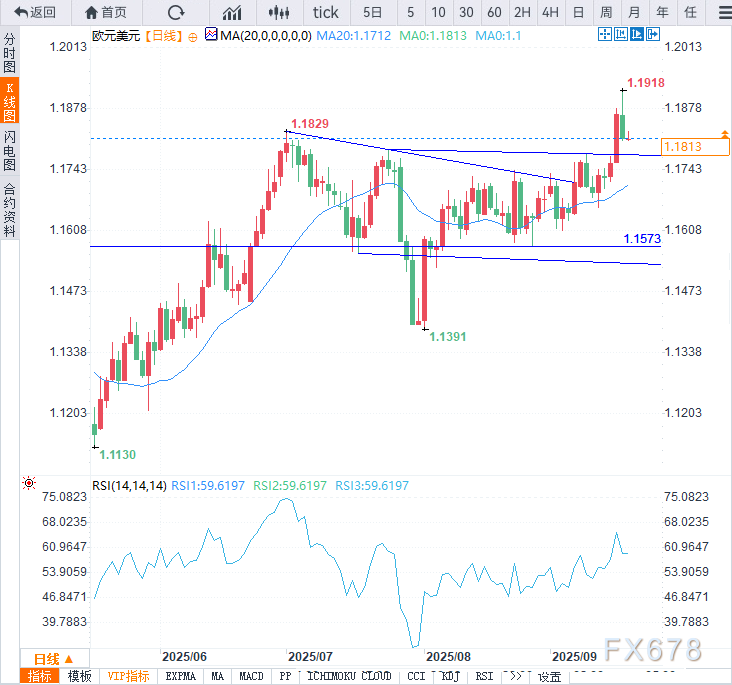 上行方面,1.1900仍构成短期阻力位,若突破1.1900水平,后续目标将指向1.1950及1.2000心理关口。