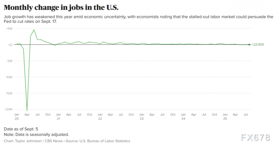 与此同时,劳动力市场正显现疲软迹象:包括特朗普誓言要重振的制造业在内的多个行业,在8月均出现岗位削减。这导致招聘活动显著放缓——6月至8月雇主月均新增就业人数仅为2.9万,远低于2024年月均约10.6万的水平。