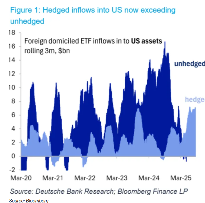 海外投资者正在以“前所未有的速度”削减美元敞口,因为他们在购买美国股票和债券时进行了货币对冲。根据德意志银行对交易所交易基金(ETF)的分析,本十年首次出现美元对冲ETF的资金流入超过非对冲基金的情况。