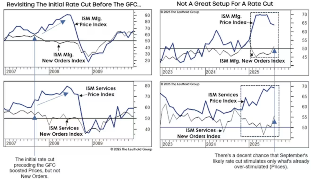 正如拉姆齐在评论附图中所示,2007年的首次降息推高了价格,却未能提振供应管理协会(ISM)服务业和制造业采购经理人指数(PMI)所衡量的新订单量(这两项指标被投资者密切关注,视为关键经济领先指标)。