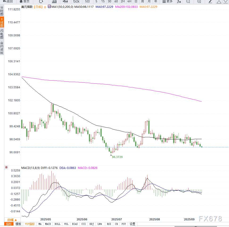 美元指数延续疲软走势。周二亚洲交易时段,DXY下跌0.1%至97.20,刷新三周低点。投资者普遍认为,美联储将在周三正式开启新一轮宽松周期。CME FedWatch工具显示,市场已完全定价本次25个基点的降息。