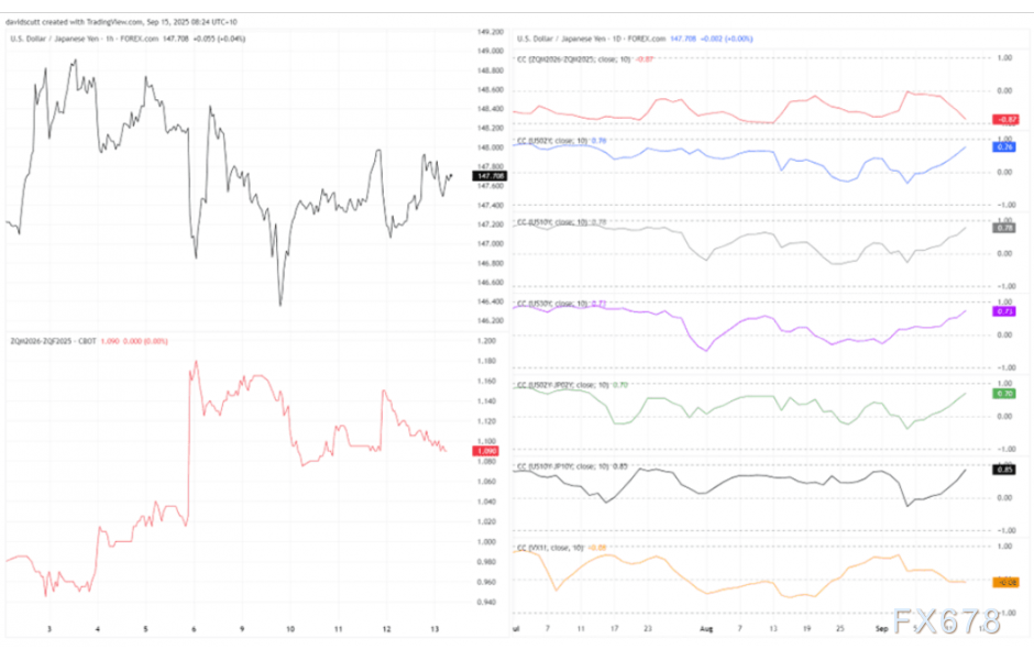 随着市场对美联储降息预期已定价至2026年6月(红线所示),相关系数强化至-0.87,表明过去两周美元兑日元几乎始终呈反向波动。当利率预期升温时,汇价通常下跌,反之亦然。图表左侧清晰呈现这一规律:上方窗口显示美元兑日元走势,下方窗口显示市场定价——当前109个基点的定价意味着超过四次25基点的完整降息。不出所料,美元兑日元与远端美国收益曲线的正相关性亦同步增强:与两年期(蓝色)、十年期(灰色)及三十年期收益率(紫色)的相关系数在此期间全面走强,美日两国两年期与十年期收益率利差(绿色与黑色)同样如此。进一步印证利率主导地位的是,美元兑日元与美股预期波动率的关联性在过去两周可忽略不计,表明风险偏好并非当前关键驱动因素。